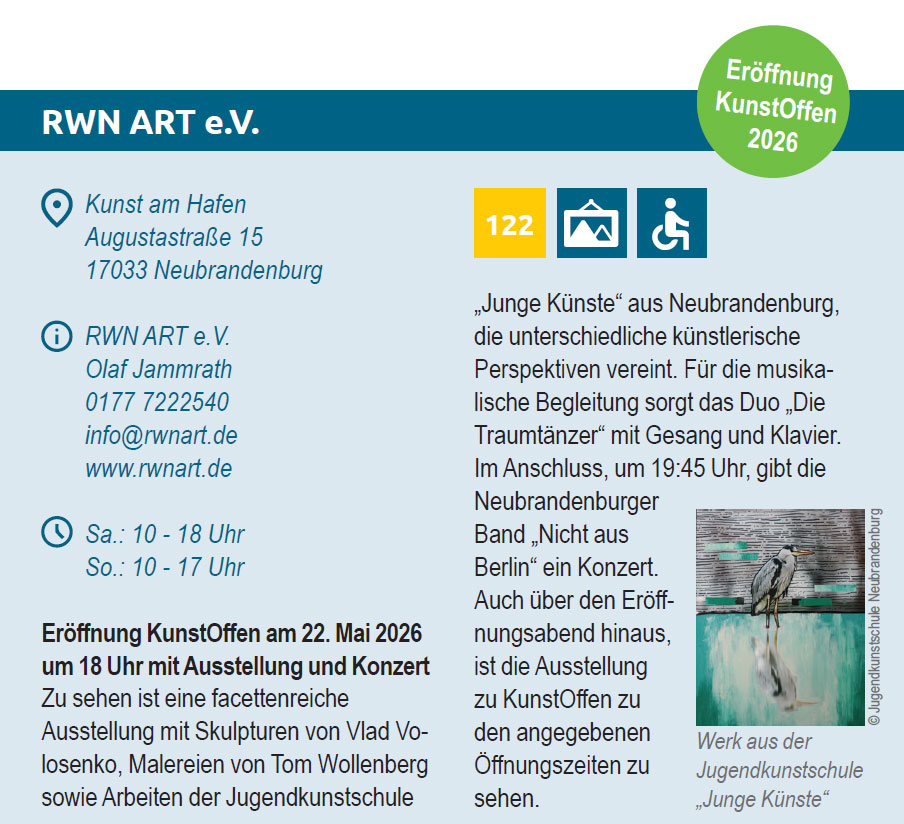 KunstOffen wird in diesem Jahr am Freitag, den 22. Mai 2026 um 18 Uhr in der Galerie „Kunst am Hafen“ in Neubrandenburg auf dem RWN-Gelände eröffnet. Die Besucherinnen und Besucher erwartet eine Gruppenausstellung, in der Werke aus der Jugendkunstschule Neubrandenburg sowie Werke der Künstler Tom Wollenberg – Malerei und Vlad Volosenko– Skulptur zu sehen sein werden. Musik, Künstlergespräche sowie ein freudvolles Miteinander werden geboten. Der Verein freut sich auf ihren Besuch.